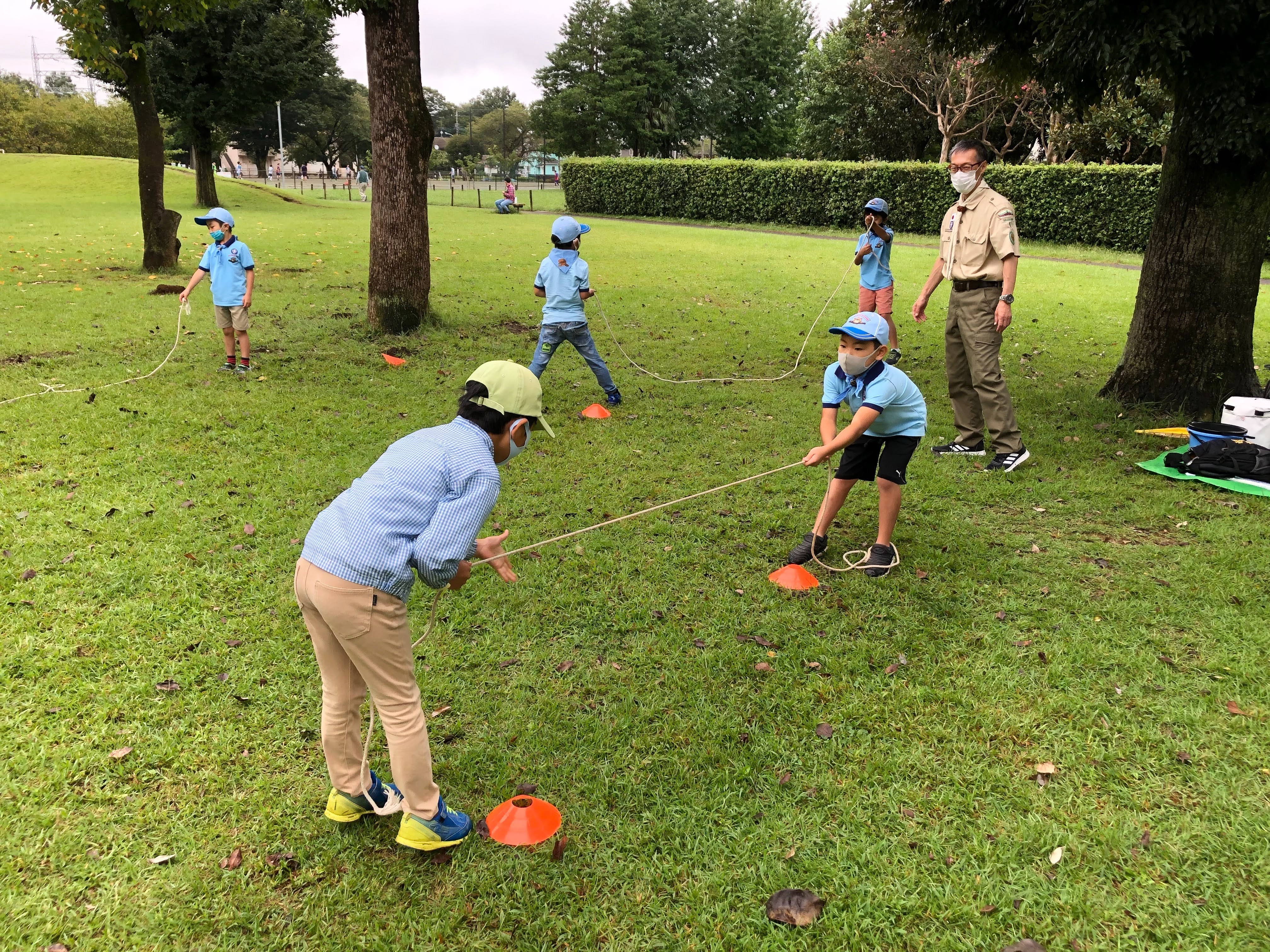 今日は、ビーバー隊だけで運動会をしました。準備運動の後、二人一組になって8の字綱引きをしました。シンプルな遊びですが、スカウトたちには新鮮だったようで、結構盛り上がりました。